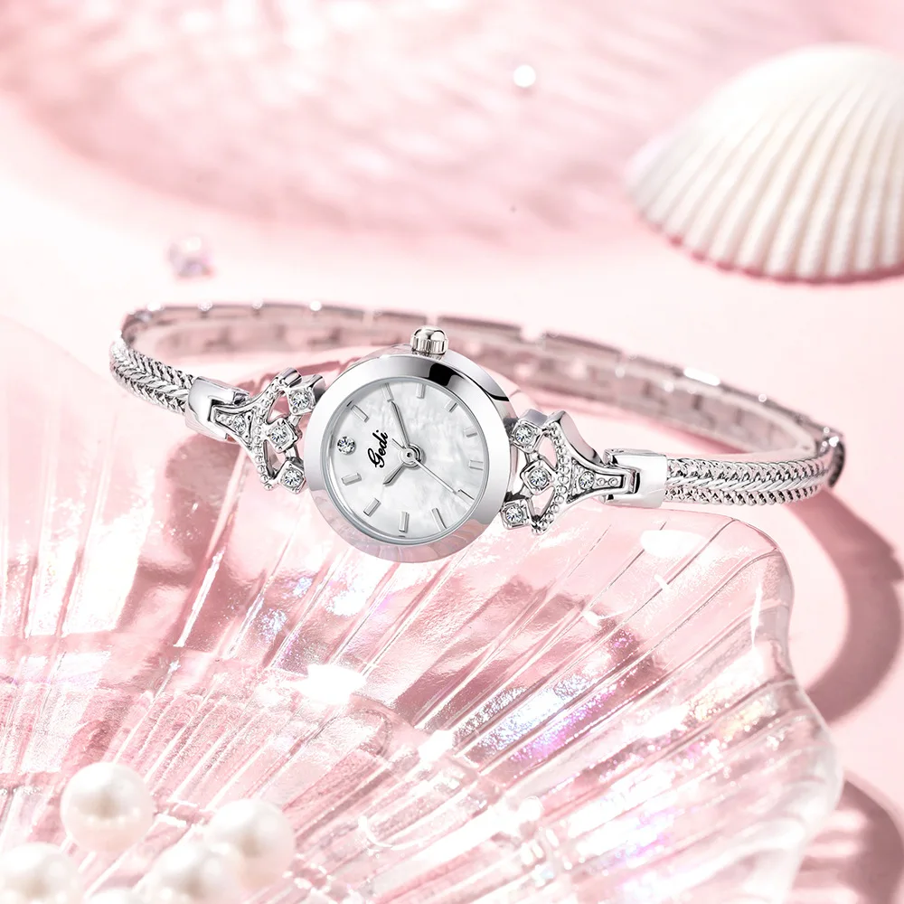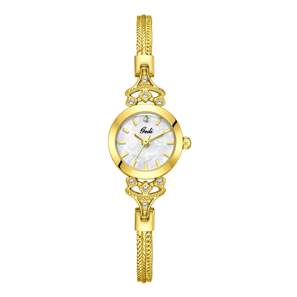 The refined round case and minimalist numberless dial create a clean, sophisticated look. Its delicate gold bracelet-style band adds a luxurious and feminine touch, making it ideal for everyday wear, business outfits, evening looks, or special events.
